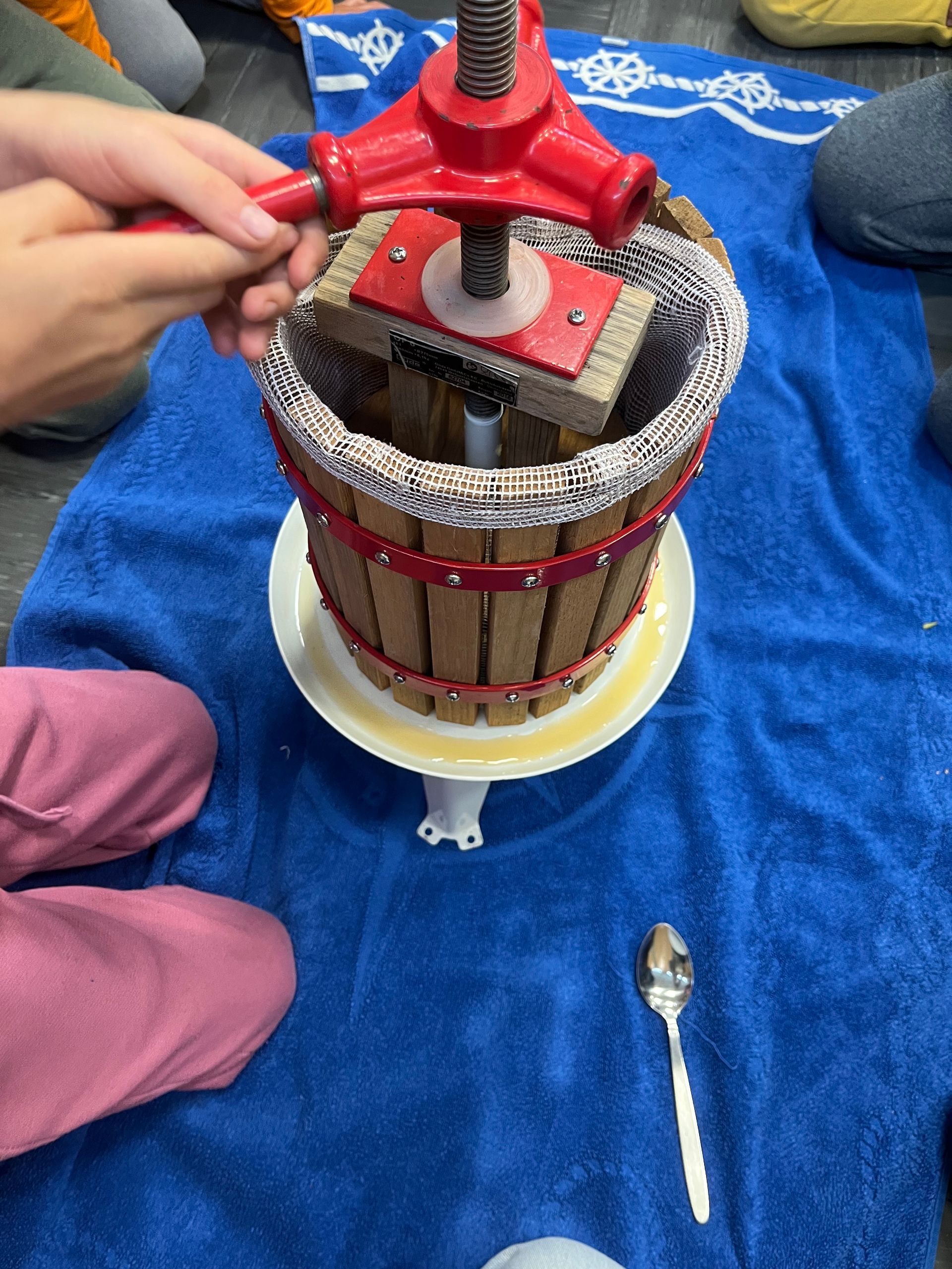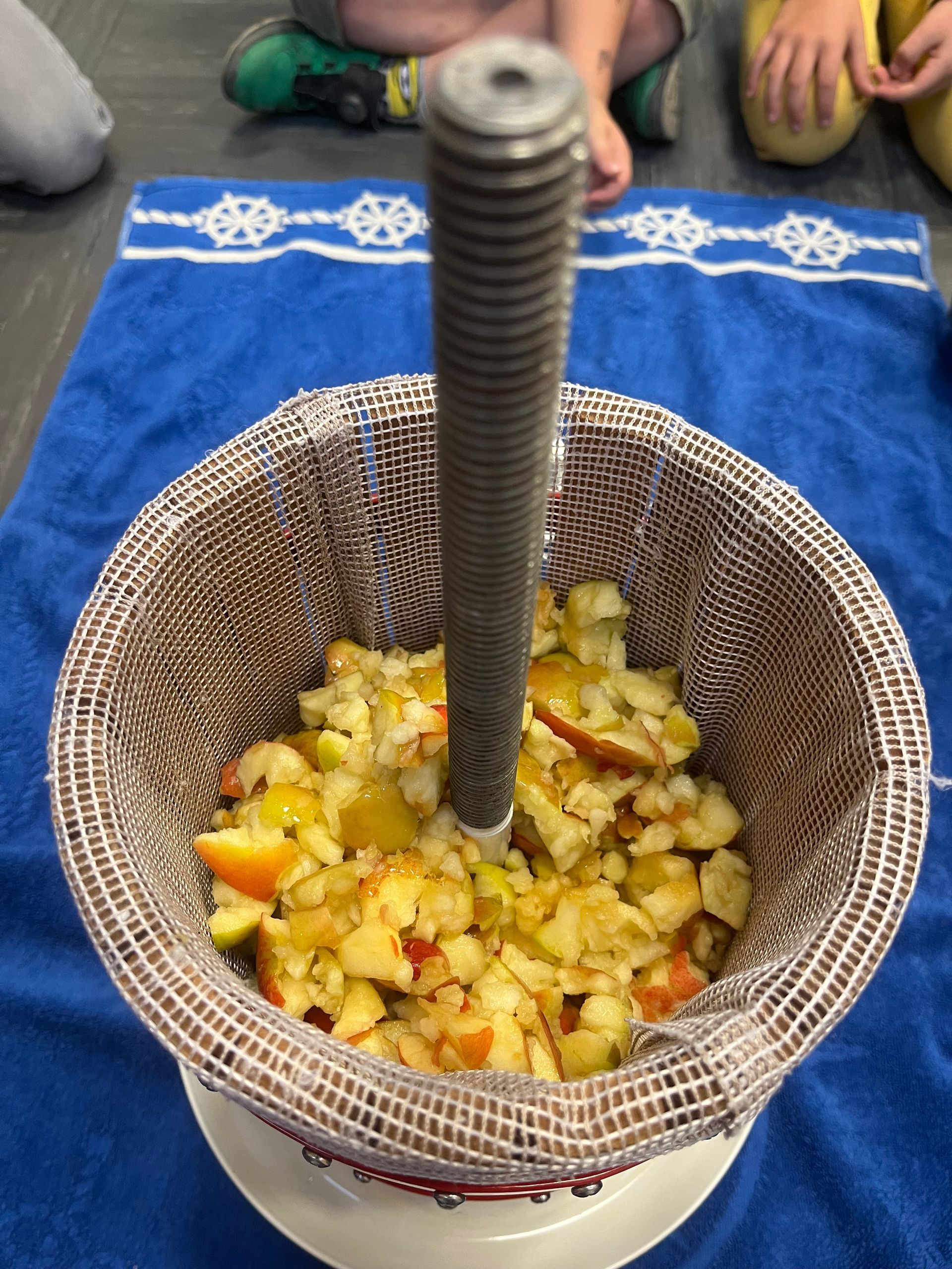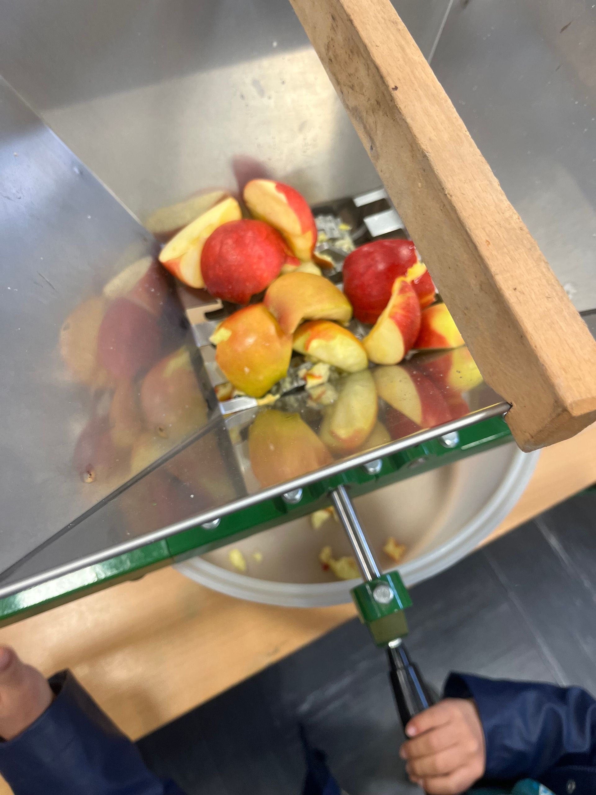Nachdem die Äpfel bereits gewaschen und geviertelt wurden, zerhäckselten wir die Äpfel noch kleiner, damit sie besser gepresst werden konnten. Alle Kinder durften mithelfen. Die zerschredderten Äpfel (die sogenannte Maische) füllten wir in einen Presssack in das Fass der Apfelsaftpresse. Es machte allen Kindern Spaß, die Presse so zu drehen, dass die Apfelstücke zerquetscht wurden und der Apfelsaft herausströmen konnte.