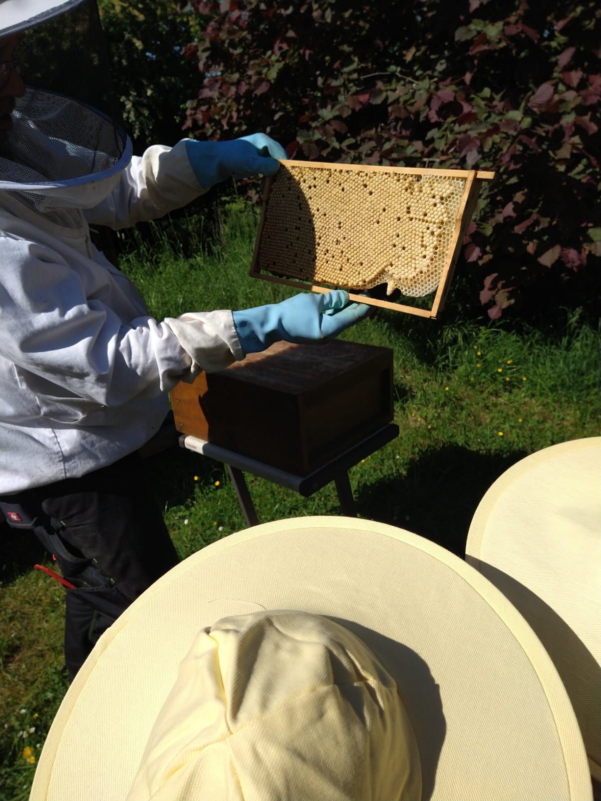 Vor Ort durften die Kinder die Bienenstöcke aus nächster Nähe betrachten und erfuhren viel Wissenswertes über das Leben der Bienen. Ausgestattet mit Imkerkleidung konnten die Kinder sicher und neugierig die Waben und Bienen ganz genau begutachten.