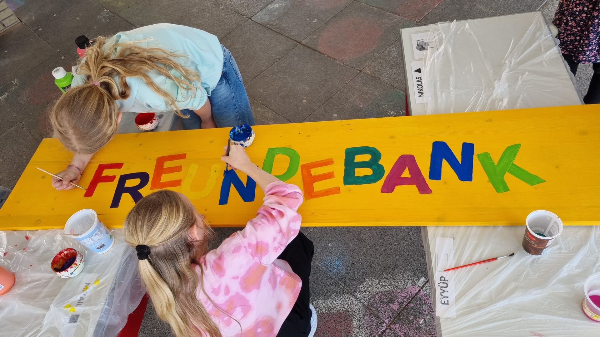 Ein besonderes Highlight war das gemeinsame Gestalten unserer neuen Freundschaftsbank. Mit viel Liebe zum Detail bemalten wir die Bank in fröhlichen Farben und machten sie zu einem echten Hingucker. Aber sie ist nicht nur schön – sie hat auch eine wichtige Aufgabe: