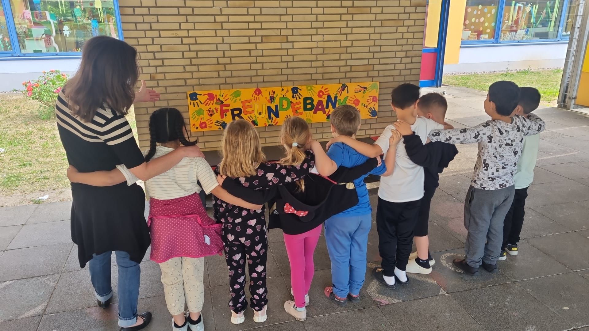 Sie soll dabei helfen, dass jedes Kind in den Pausen jemanden zum Spielen findet. Wer gerade niemanden zum Spielen hat oder gerne neue Freunde finden möchte, kann sich einfach auf die Bank setzen. Andere Kinder können sich dazusetzen oder das Kind zum Spielen abholen. So möchten wir erreichen, dass niemand allein bleibt und alle die Chance haben, neue Freundschaften zu schließen.